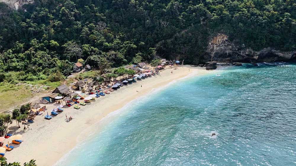 Atuh Beach is a stunning coastal paradise located on the southeastern coast of Nusa Penida Island in Bali, Indonesia. It is known for its breathtaking natural beauty, crystal-clear turquoise waters, and dramatic cliffs that surround the beach.